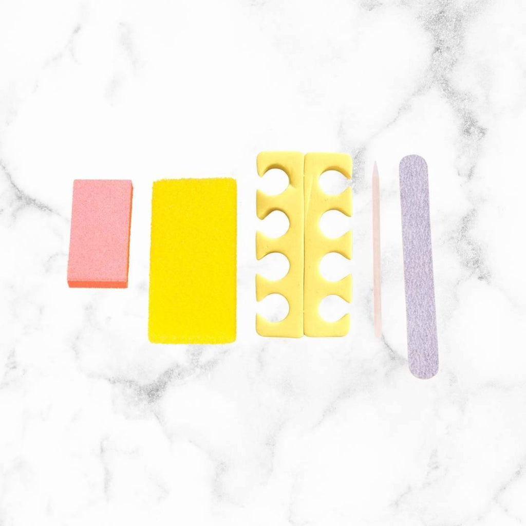 - Buffer Block- Pumice Rock- Toe Separators- Wooden Pusher- Nail FileColours and styles may vary.